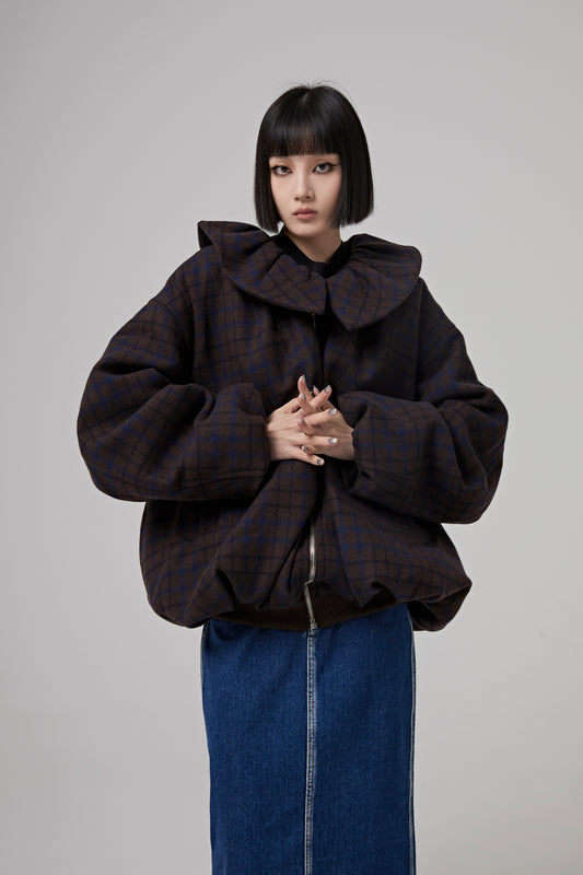 BROWN WOOL CHECK SHIRRING OVERSIZED JUMPER